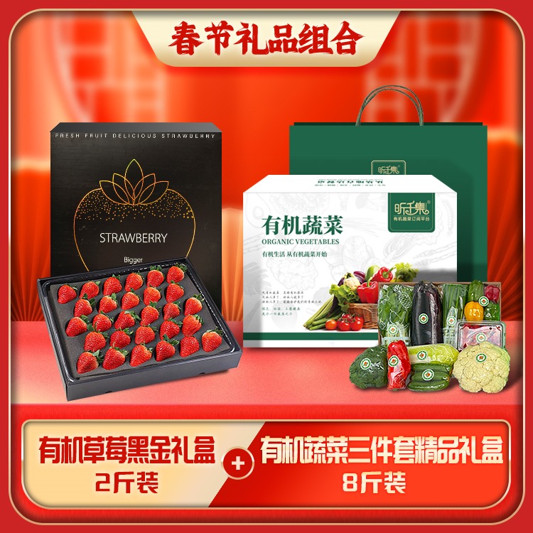 【2026春节年货礼品组合】8斤装有机蔬菜三件套精品礼盒+丹东有机九九草莓黑金礼盒(2斤)