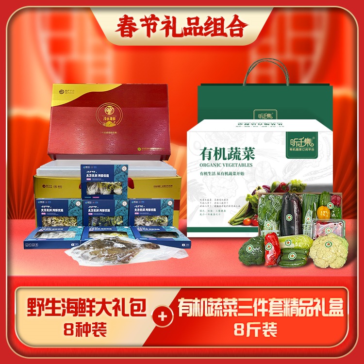 【2026春节年货礼品组合】8斤装有机蔬菜三件套精品礼盒+野生海鲜礼盒(8种海鲜)